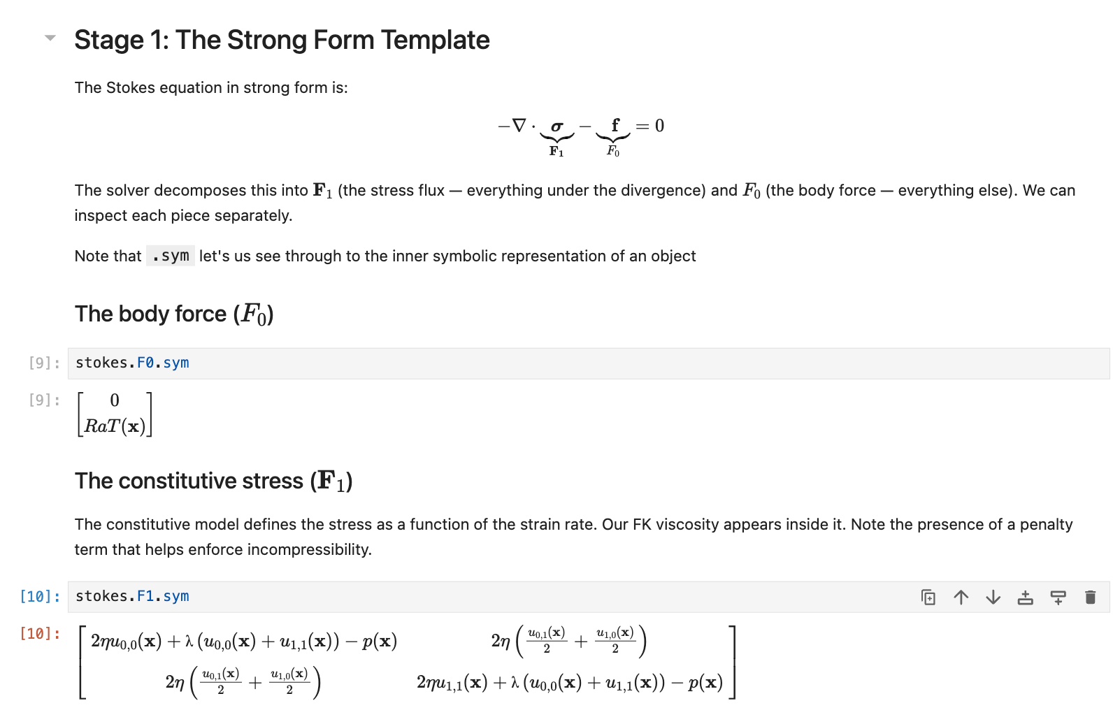This is sympy.derive_by_array() applied to the user's constitutive law. For a simple linear viscosity, $G_3$ is just the viscosity tensor. For a nonlinear rheology (strain-rate-dependent, pressure-dependent, with yield criteria) the derivatives can be complex, and SymPy computes them exactly. No finite-difference approximations, no hand-coding. What is more, they can be checked through introspection and interaction because they are symbolic before and after differentiation.