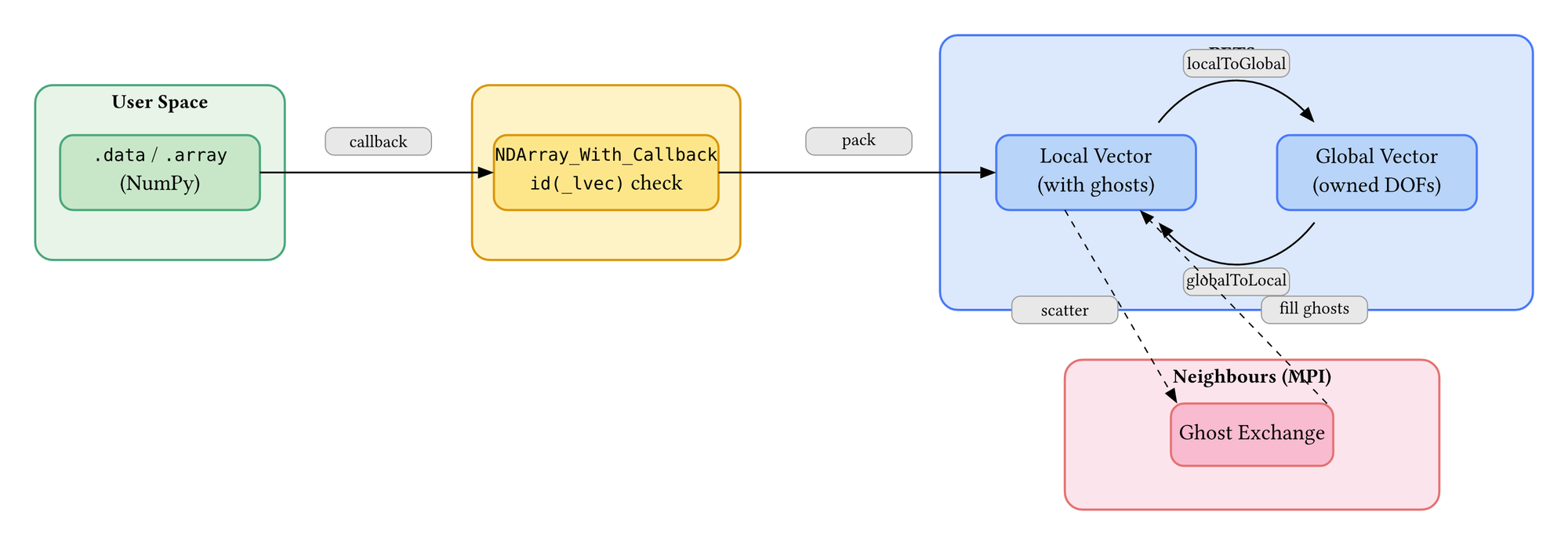 The division is clean: users work through .array (safe, synchronised, cached). Solvers work through .vec (direct, fast, PETSc-native). The two paths share the same underlying memory — the PETSc local vector — so there is no data duplication.